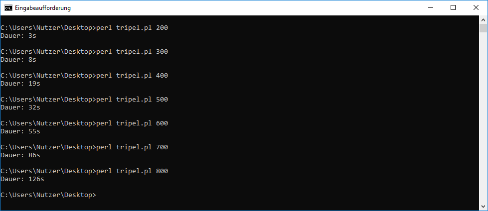 Das Programm für die pythagoräischen Zahlentripel wird auf einen alten Computer gestartet. Als Parameter wird 600 eingegeben. Da dieser Rechner schon etwas betagt ist, braucht er dafür 80s. Es soll jetzt berechnet werden, wie lange der Computer braucht, wenn als Parameter 3000 eingegeben wird.
