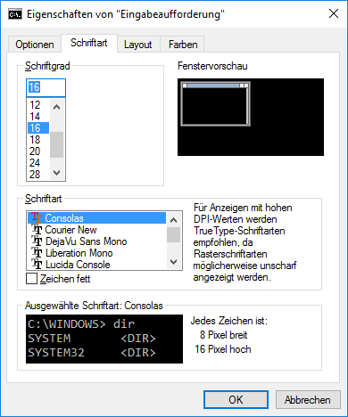 Im Fenster "Eigenschaften von Eingabeaufforderung" wähle ich den 2. Reiter "Schriftart". Dort als Schriftgröße "16" ausgewählt und dann auf "OK" gedrückt.