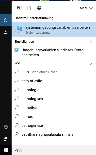 Um den Path anzupassen, habe ich "Path" eingegeben. Dann auf den Menüpunkt "Systemumgebungsvariablen bearbeiten" geklickt.