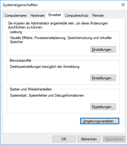 Es kam das Fenster "Systemeigenschaften". Dort den untersten Punkt "Umgebungsvariablen ..." anklicken.