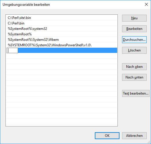 Da eine neue Variable hinzugefügt werden soll, auf "Neu" klicken. Um die richtige Schreibweise zu bekommen, auf "Durchsuchen..." klicken.