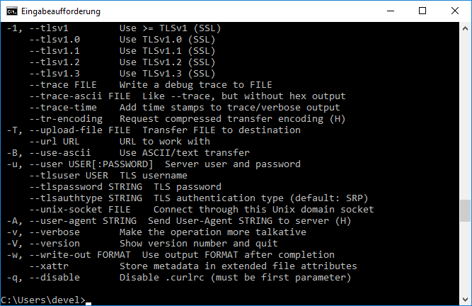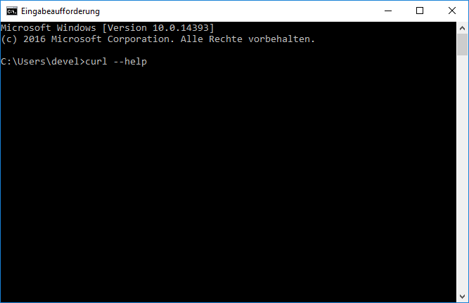 Zur Kontrolle habe ich dann "curl --help" in der Eingabeaufforderung aufgerufen.
