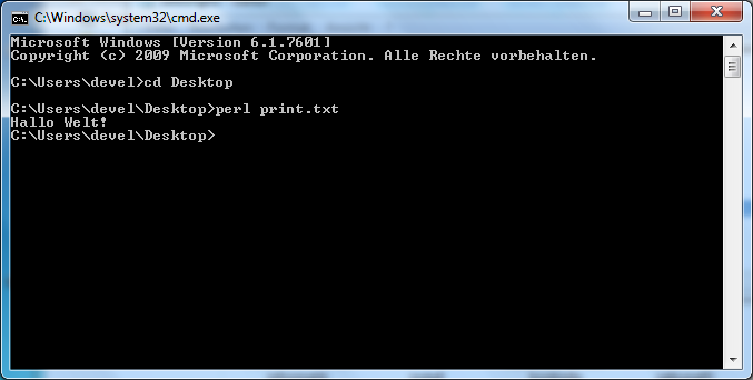 Hallo WeltZielstellungEs sollen heute die ersten Perlprogramme zum Laufen gebracht werden. Insbesondere das übliche "Hallo Welt". Dabei geht es insbesondere um das Händling der Programmierumgebung Editor + Eingabeaufforderung. Aufgabe 1Öffne die Eingabeaufforderung mit der Eingabe von "cmd" und gehe zum Desktop mit: cd Desktop