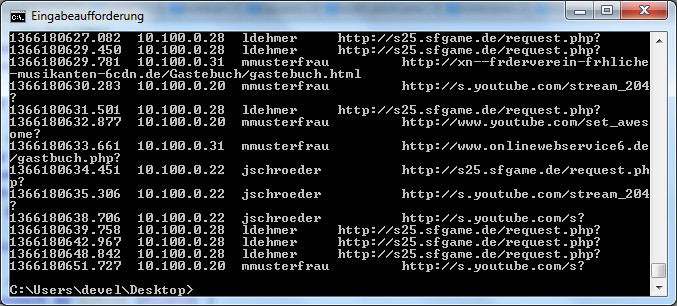 Dazu soll das Login des Users, die IP, das Datum, die Uhrzeit und die URL der aufgerufenen Webseiten (keine Bilder, Downloads, CSS-Dateien u.ä.) ausgegeben werden.