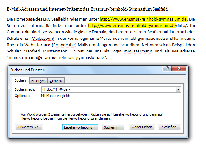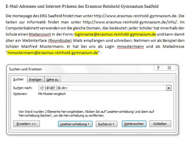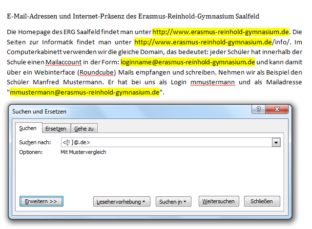 Das ergibt folgendes Muster: "<[! ]@.de>". Das Ergebnis der Suche sieht dann so aus: