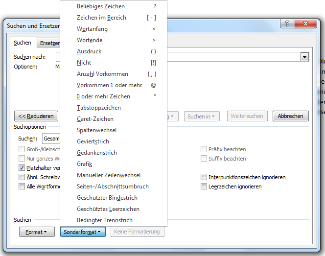 5. Klick auf "Sonderformat" zeigt Sonderzeichen |