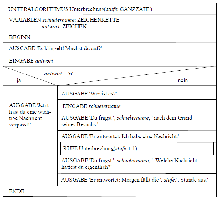- Der gegebene Algorithmus wird mit Unterbrechung(1) aufgerufen. Geben Sie die Ausgaben an, wenn Anke, Bert