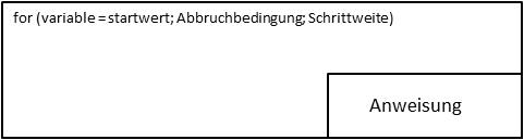Die Webseiten der Fachschaft Informatik am ERG Saalfeldfor-SchleifeStruktur einer for-Schleife:for (Startwert der Variable; Bedingung für die Variable, Schrittweite) { Anweisungen } Struktogramm:![]() Beispiel:starte mit x = 1; tue solange x < 10, erhöhe in 2er Schritten schreibe das x und ein Leerzeichen