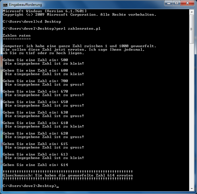 - Wie müßte die Zeile mit my $gewuerfelte_zahl = int(rand ... aussehen, damit die Zahlen wirklich zwischen 1 und 1000 liegen?