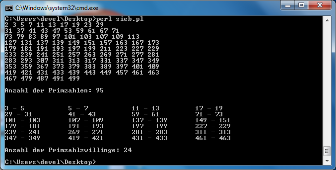 - Auch die Primzahlzwillinge sollen ausgegeben werden (hier fordere ich kein bestimmtes Format, allerdings muss die Lösung erkennbar sein).